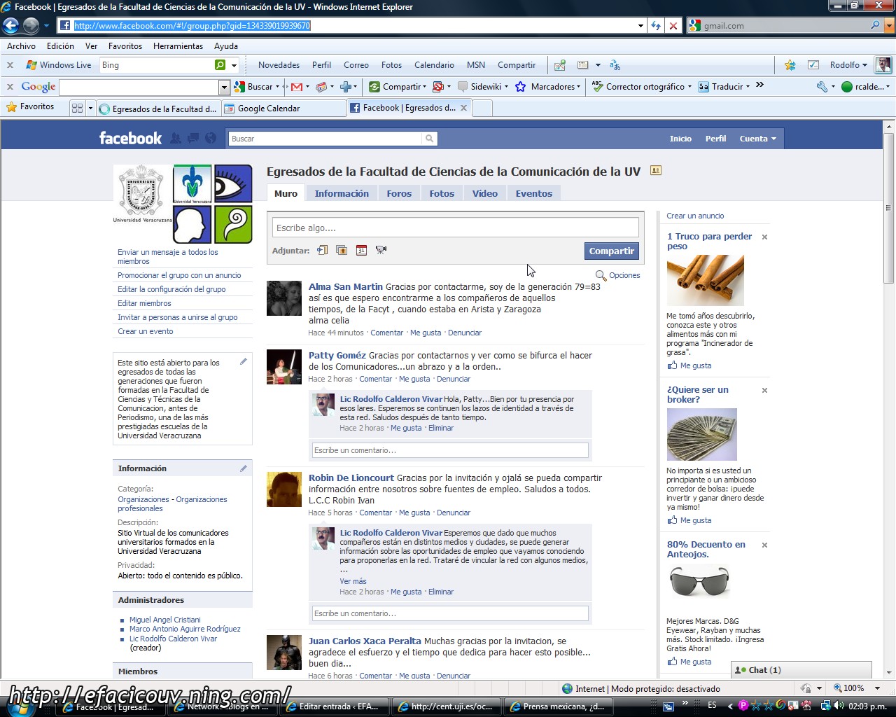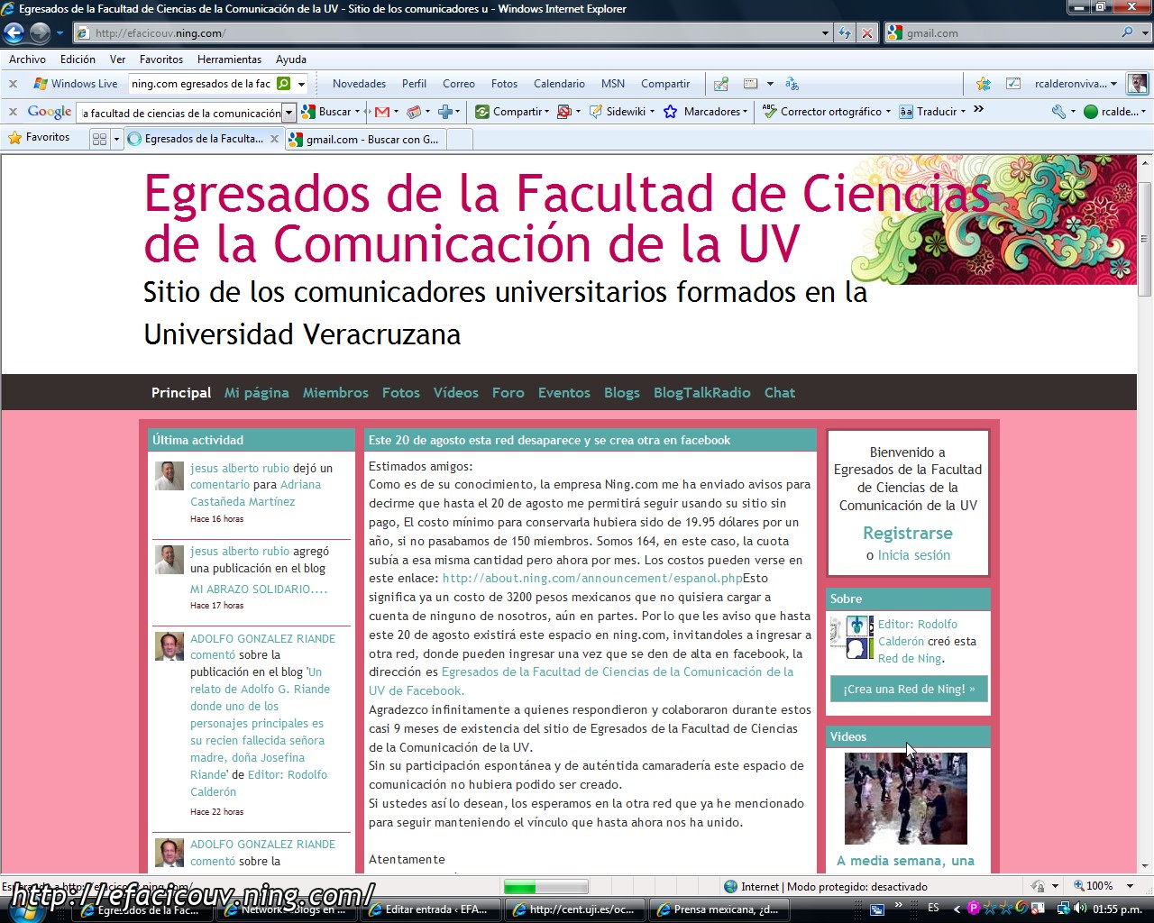 Gran parte de nosotros fuimos enterados de que ya tenemos otra forma de comunicación, a través de un sitio en facebook al cual hemos sido invitados todos a integrarnos para seguir comunicándonos instantáneamente. Para ingresar a él solo hay que buscar la denominación «Egresados de la Facultad de Ciencias de la Comunicación de la UV» en el buscador de facebook, para inscribirse y recibir comunicados diariamente. También puedes conectarte ahora mismo si haces click en la frase subrayada en azul de su nombre que redactamos líneas antes