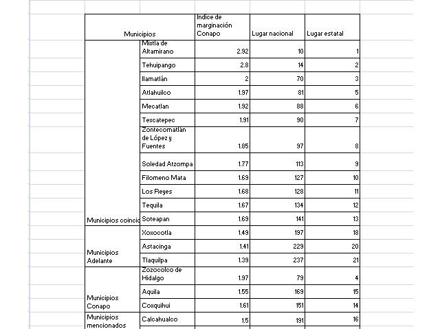 Aunque, en Veracruz, como bien se reconoce en el Programa Adelante, existen 37 municipios con Muy Alta marginación, de acuerdo con el listado que elaboró el Consejo Nacional de Población Conado con datos de 2005.