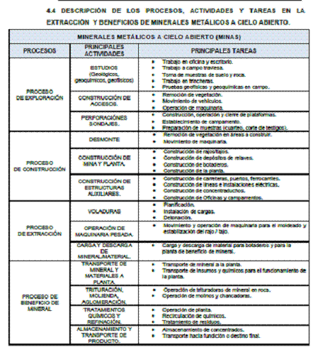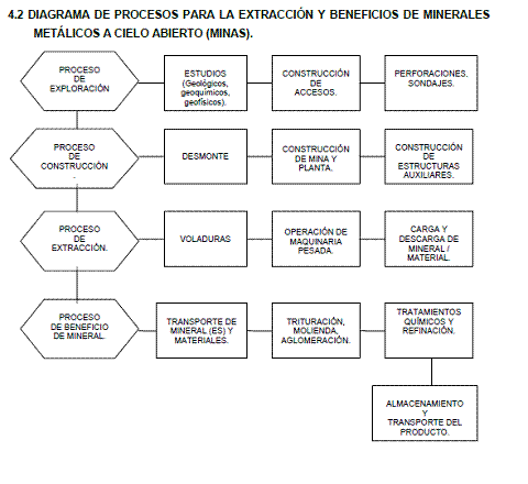 A continuación presentamos a ustedes un diagrama de procesos, basado en las normas internacionales, que describe las etapas de procesos de actividades de las minas a cielo abierto, que está contenido en la Guía Técnica para la Prevención de los riesgos profesionales en Minas y Canteras a Cielo Abierto, publicado por el Gobierno de Panamá, para controlar cada etapa de desarrollo minero en su país, siguiendo las normas internacionales y que demuestra que el delegado de la SEMARNAT, Manuel Molina, que afirma que la mina “Caballo Blanco” esta funcionando en su etapa de exploración, “para lo cual si tiene permiso”, está o demostrando ignorancia de cómo funciona una mina de tales características, o actuando de mala fe, desinformando, para beneficiar al grupo minero Golden Group y su minera “Cardel”.