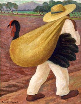 El artista recurre a los conceptos de la abundancia, la fertilidad y la naturaleza que conjuga con la desnudes de la mujer indígena, pero también con la vida cotidiana del campo como en “Campesino cargando un guajolote.