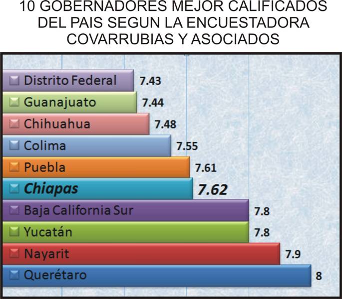 No sé en que se basó la empresa encuestadora, “Covarrubias y Asociados” para elegir a los “diez gobernadores mejor calificados” (calificados de que o en qué) entre los que el Ejecutivo de Chiapas se coloca en el quinto lugar. ¿Cuáles fueron las acciones, alternativas o trabajo administrativo evaluados para obtener tales promedios? No sé, pero MANUEL VELASCO COELLO y su gobierno está en el quinto lugar con 7.62 de calificación en una escala del 1 al 10, seguramente.