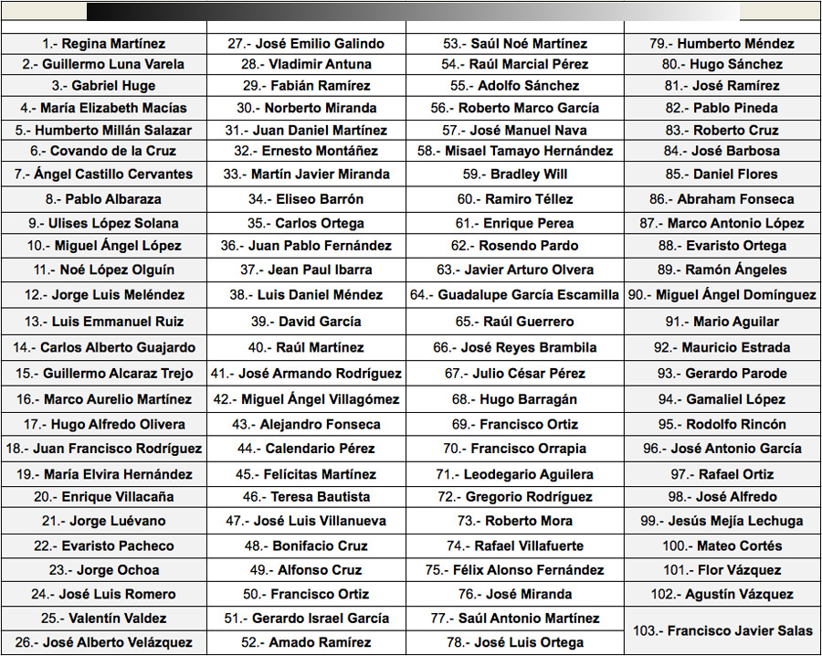 En un reporte de “yo acuso” estas organizaciones, señalan que del año 2000 al 28 de febrero de 2012, los homicidios aumentaron a 120; 101 periodistas; 9 trabajadores de la prensa; 7 familiares; 2 amigos de comunicadores y 1 ciudadano alejado de la actividad periodística. En el Estado de Veracruz –considerado el más peligroso para ejercer el periodismo—del 2010 a la fecha, durante el gobierno de JAVIER DUARTE DE OCHOA han sucedido nueve homicidios, entre ellos el de REGINA MERCEDES MARTÍNEZ PÉREZ, corresponsal de la revista Proceso; MIGUEL ÁNGEL LÓPEZ VELASCO “Milo Vela”, su esposa, su hijo el foto-reportero, MISAEL LÓPEZ SOLANA y YOLANDA ORDAZ DE LA CRUZ, integrantes del diario NOTIVER, del Puerto de Veracruz.