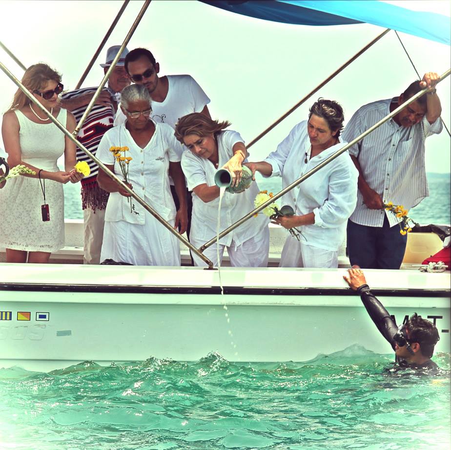 A él también le fue entregada la vasija mientras flotaba sobre el mar para regar las últimas cenizas de la cantante. Después, sigiloso se sumergió a tres metros de profundidad y colocó las piedras en el corazón la Diosa Chalchiuhtlicue, réplica sumergida en el año 2006 por la Fundación Chalchi.