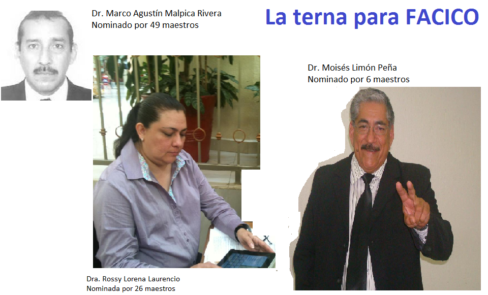 En la nominación que hicieron los profesores de la FACICO, el Dr. Marco Agustín Malpica Rivera fue propuesto por 49 miembros de la academia; la Dra. Rossy Lorena Laurencio, por 26 maestros y el Dr. Moisés Limón Peña, fue nominado por 6 votos del magisterio de la facultad.