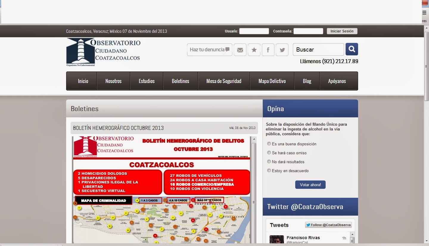 Pero casualmente, casi al mismo tiempo que en el puerto de Veracruz se realizaba la reunión regional del gabinete de seguridad zona sureste, en el sur de la entidad, en Coatzacoalcos, el Observatorio Ciudadano daba a conocer el reporte del mes de octubre, http://www.coatzaobserva.org/v2/?seccion=Boletines&id=10220#up en el que contrariamente a lo asegurado por las autoridades del estado ante el secretario de Gobernación, los índices de delincuencia y en consecuencia inseguridad, en lugar de ir a la baja van en aumento.