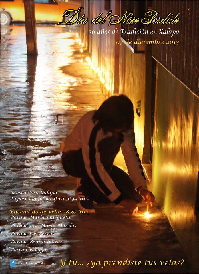 Amigos…los esperamos a todos el próximo Sábado 7 de Diciembre en El Paseo de los Lagos, Parque Benito Juárez, Parque Los Berros, Parque María Enriqueta y Parque Morelos…para celebrar los 20 años del Día del Niño Perdido en Xalapa. Los esperamos con sus velas para alumbrar el camino nocturno.