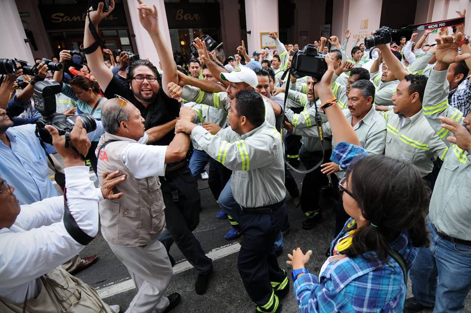El líder de TAMSA, Pascual Lagunes, caminaba en el centro del círculo de sus trabajadores que estaban estratégicamente distribuidos y entrelazados con los brazos para no romper la rueda que lo protegía. A la altura del hotel Veracruz, reporteros de varios medios de comunicación intentaron entrevistar a Pascual, la respuesta de sus esbirros fue una agresión en contra de los fotógrafos con el puño cerrado, codazos, jalones y el manoseo a varias reporteras. El líder sonreía socarronamente, complaciente. Le dijeron lo que estaba ocurriendo y él impasible caminando como si nada. Los guaruras que cuidaban al dirigente “espurio” iban cargados con cartones six-pack de cervezas Heineken, Corona, Sol, Indio, Tecate y Superior, metidas en bolsas de OXXO…