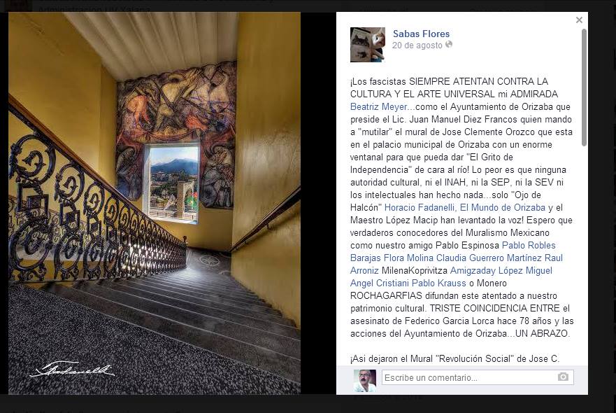 Primeramente, habría que dar crédito al periodista cordobés Sabas Flores, quien en su muro de Facebook publicó el 20 de agosto un mensaje en el que informaba de que el alcalde de Orizaba “mandó a mutilar el mural de José Clemente Orozco que está en el palacio Municipal de Orizaba para dar el grito de independencia”. En donde además nos pide a un grupo de periodistas que se difunda el atentado a nuestro patrimonio cultural, según puede leerse textualmente en su página: