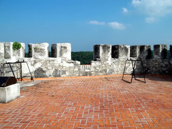 - La terraza admite cañones en 5 de sus 7 lados. Inicialmente fue armado con un obús* para proyectiles con peso de 4 libras y un cañón de 6. Pero podían subirse incluso las pesadas piezas de a 12 libras. Las cortas piezas llamadas obuses disparaban municiones explosivas con metralla en ángulos elevados, logrando un alcance de entre 450 y 1.600 metros desde la altura de 70.26 metros en que se halla el fortín; construido a propósito en la cresta de un cerro con 3 de sus 4 lados inaccesibles para subir. Con estas ventajas no precisaba de montar decenas de cañones como los baluartes y podía controlar visualmente tanto las calzadas como puentes del Camino Real situados más abajo.