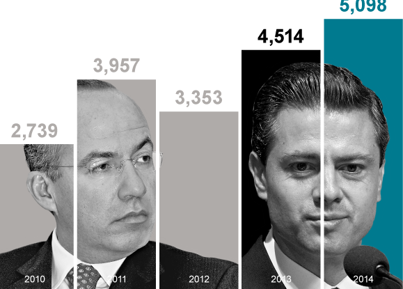 ¿Cuáles instituciones? ¿Las que su jefe dijo que están debilitadas y mimetizadas con el crimen organizado?Sentía que… pensaba en él”, narra Carol Joyce Oates entre las páginas 21-22 de su más reciente y portentosa novela:Carthage (2014); y ese <él> a quien se refiere la escritora es Zeno Mayfield, padre que busca a Cressida, su hija desaparecida a los diecinueve años y ambos personajes de ficción. “Vivos se los llevaron, vivos los queremos”, gritan los padres de los 43 jóvenes desaparecidos en Iguala que sumados a los más de nueve mil seiscientos que hasta hoy han desparecido desde que inició el sexenio de Enrique Peña y a los acumulados en el sexenio de Felipe Calderón suman ya más de veintidós mil seiscientos (ver nota y gráficas elaboradas porHarriet Alexander, Sam Dodge y Andrew Marszal para The Telegraph del 5 de diciembre inmediato pasado); esos ellos y ellas a los que se refiere la nota periodística son, desgraciadamente, personas reales buscadas aún por gente que bien puede no creer en, como dice Zeno Mauyfield, estupideces místicas, lo que no obsta para ejercer su derecho a, Ernst Bloch dixit, <el principio esperanza>.Venga el mismo Saviano de líneas atrás aunque ahora en Gomorra (2007): “Tres mil seiscientos muertos desde que nací [en 1979]. La Camorra ha matado más que la mafia siciliana, más que la ‘Ndrangheta, más que la mafia rusa, más que las familias albanesas, más que el total de los muertos causados por ETA en España y por el IRA en Irlanda, más que las Brigadas Rojas, más que los NAR8 y más que todos los crímenes de Estado cometidos en Italia. La Camorra ha matado más que nadie. (p. 117)” Y en México, datos del Sistema Nacional de Seguridad Pública -SNSP- indican que del 1 de diciembre de 2012 al 31 de julio de 2014 se abrieron 57 mil 899 averiguaciones previas por homicidios doloso y culposo, casi quince mil más que los 43 mil 694 reportados en el sexenio de Calderón entre el 1 de diciembre de 2006 y el 31 de julio de 2008; asimismo, Enrique Mendoza Hernández dio a conocer el 8 de diciembre de este año, en el semanario ZETA de Tijuana, que del 1 de diciembre de 2012 al 31 de octubre de 2014 hubo en el país 41 mil 015 homicidios dolosos y que en los más recientes ocho años la cifra asciende a 125 mil 979 ejecuciones..