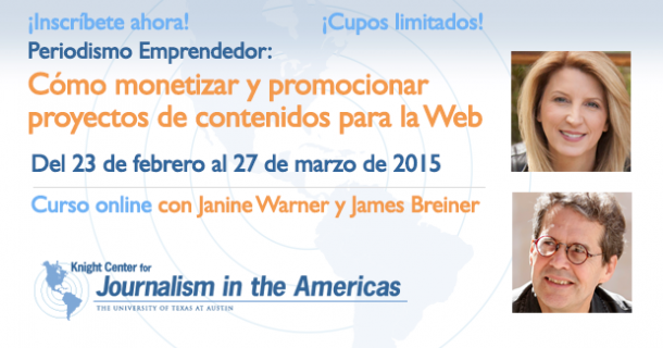 Les escribimos para invitarlos a tomar otro de nuestros cursos en línea. Esta vez, el curso se llama «Periodismo Emprendedor: Cómo monetizar y promocionar proyectos de contenidos para la web» y será dictado en español por dos expertos estadounidenses, Janine Warner y James Breiner.