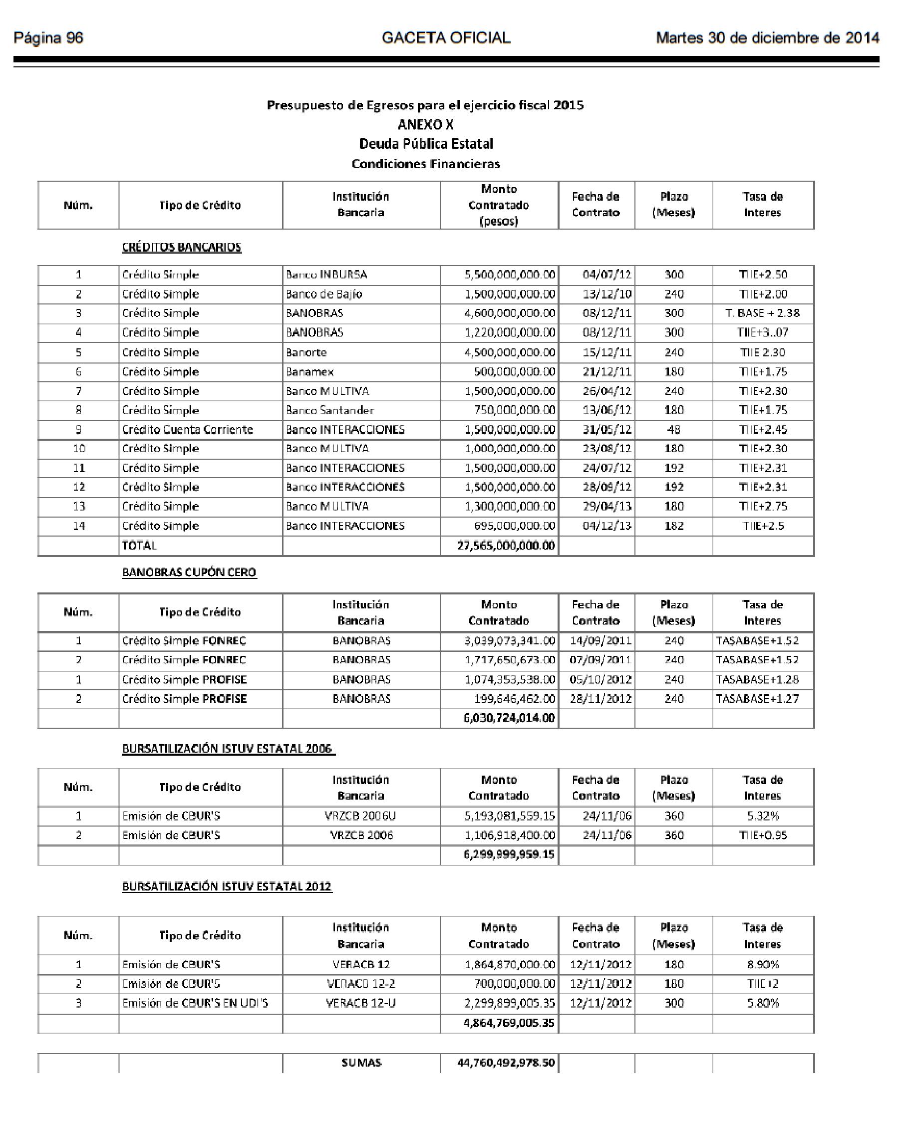 La segunda cuenta que lleva el gobierno del estado es la que corresponde al monto de los compromisos adquiridos y esa está plasmada en la página 96 de la Gaceta Oficial del Gobierno del estado de Veracruz, correspondiente al 30 de diciembre de 2014.