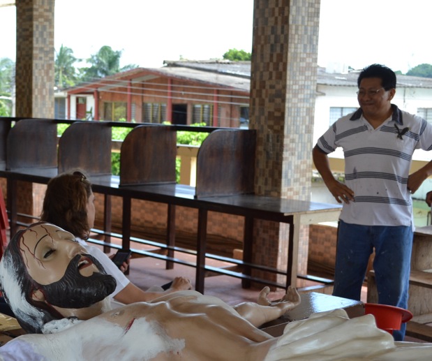 Montado en los andamios daba pincelazos sobre el retablo del altar donde se rinde el culto católico bajo una suerte de égida de San Martín Obispo.