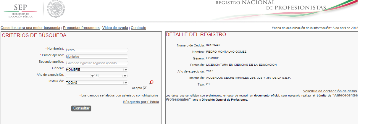 Y, efectivamente, uno puede buscar en dicho lugar,situado en: http://www.cedulaprofesional.sep.gob.mx/ y colocar en el formulario el nombre de Pedro Montalvo Gómez, para hallar que si tiene cédula profesional y que es Licenciado en Ciencias de la Educación, con un registro fresquecito del 2015, como pan salido del horno, lo cual enaltece nuevamente al Secretario de Educación de Veracruz, quien lo mismo desmiente a columnistas de prestigio que a la insidiosa vox pópuli que se atrevió a dudar del Licenciado Pedro Montalvo Gómez.