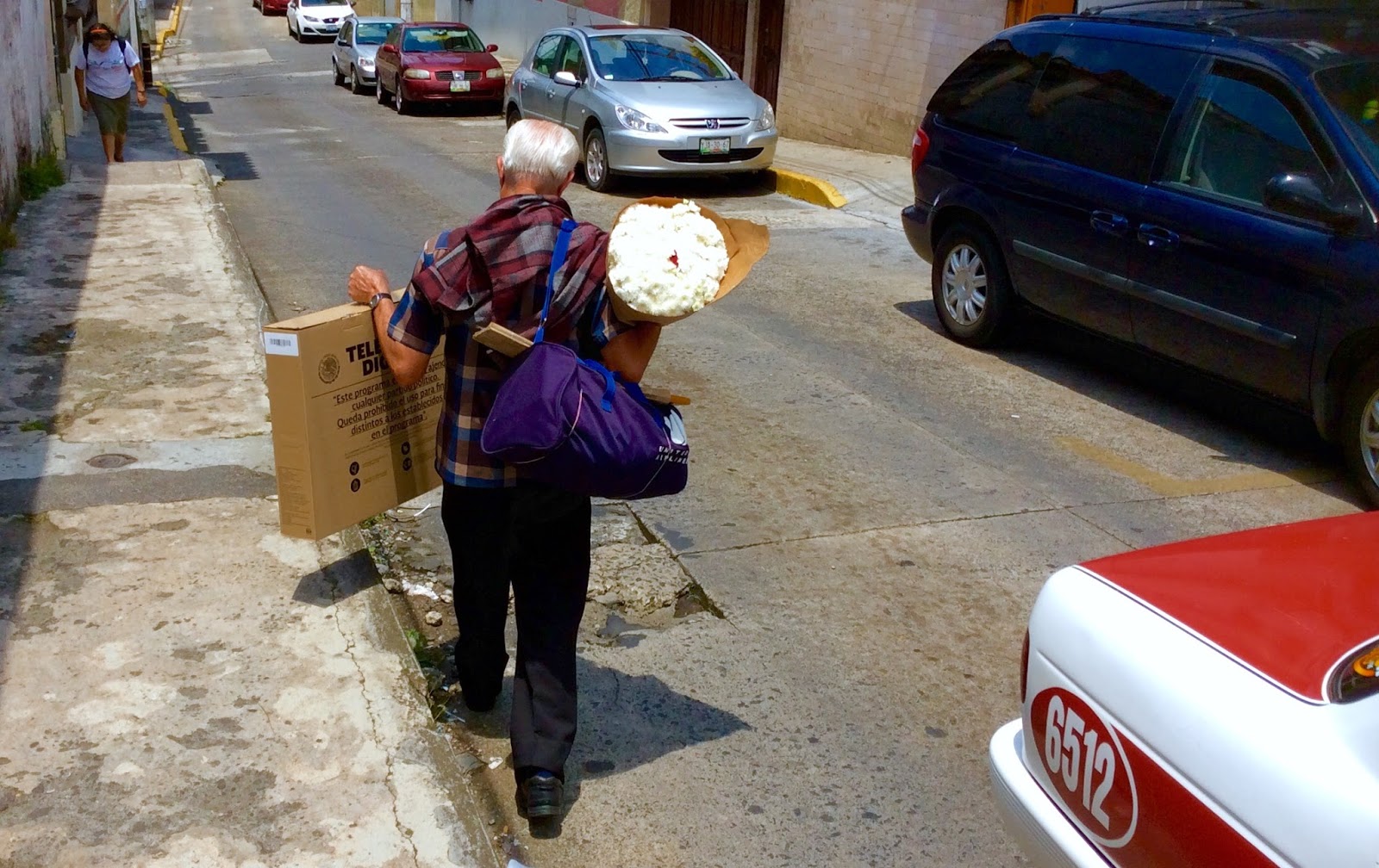 Esta semana, en una de las calles cercanas al mercado de San José, captamos a un Xalapeño de pelo canoso, que caminaba llevando una de las cajas que contienen las televisiones que llevan la leyenda “televisión Digital” el sello del escudo nacional y del otro lado la leyenda Mover a México.