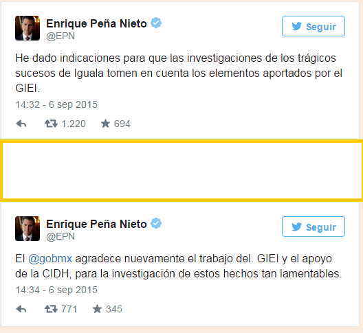 ** Ayer mismo en su cuenta de Twitter @EPN, el presidente de México dijo: «He dado indicaciones para que las investigaciones de los trágicos sucesos de Iguala tomen en cuenta los elementos aportados por el GIEI».