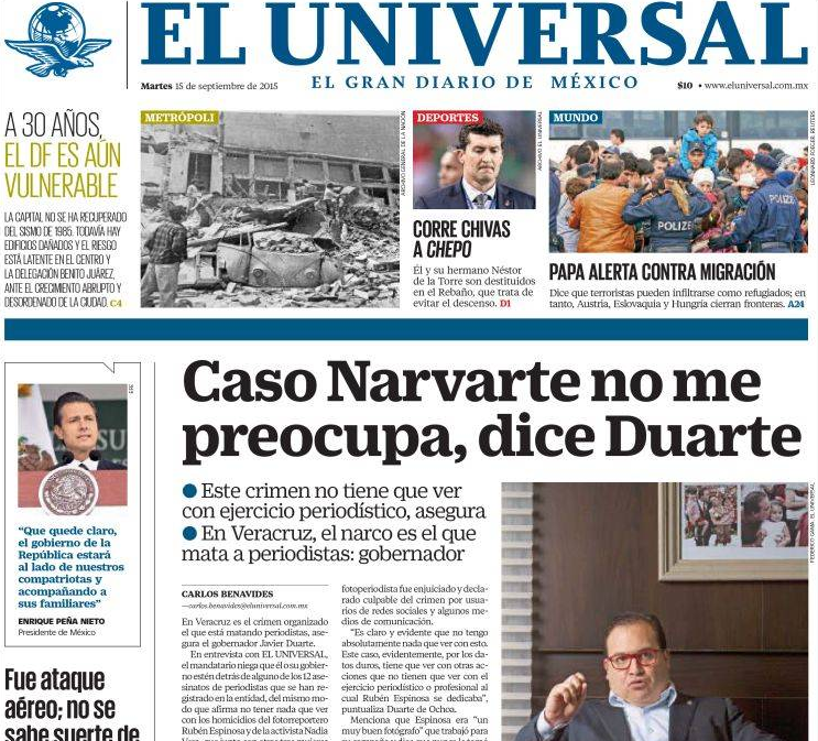 El martes 15 de septiembre, el periódico El Universal publicó en portada, nota principal a 8 columnas, una entrevista con el gobernador de Veracruz, que en tiempo y forma debió aparecer, digamos, hacia finales del año 2011, cuando iban cinco reporteros asesinados.