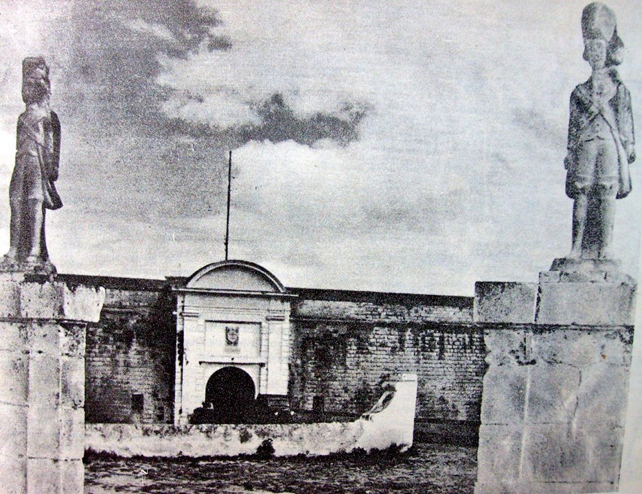 Vista de las estatuas de Ferrer y Castells desde la entrada sureste a la fortaleza de San Carlos, el 20 de noviembre de 2015 (Fuente: Archivo del Lic. Mario Jesús Gaspar Cobarruvias)