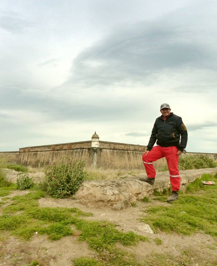 El autor de esta investigación sobre el glacis de la fortaleza de San Carlos, el 13 de diciembre de 2015 (Fuente: Archivo del Lic. Mario Jesús Gaspar Cobarruvias)Portada del libro del general Sánchez Lamego publicado en 1971 (Fuente: libro «El castillo de San Carlos de Perote»)General de división Miguel Ángel Sánchez Lamego, historiador militar y subdirector general de ingenieros de la Secretaría de la Defensa Nacional (Fuente: libro «El castillo de San Carlos de Perote»)
