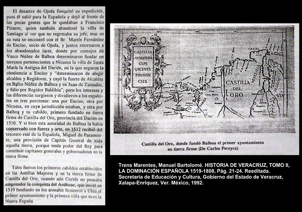 El seguimiento de las expediciones españolas señala claramente que el primer ayuntamiento en el continente americano estuvo en la Villa de la Isabela fundada en 1494 y cuyo primer alcalde fue el contino don Antonio de Torres. Y el primer ayuntamiento en tierra continental fue el de la ciudad de Santa María de La Antigua del Darién fundada en 1510 y cuyos primeros alcaldes fueron Vasco Núñez de Balboa y Juan Zamudio. Estos asentamientos fueron ratificados por los reyes españoles en 1494 y 1515, mucho antes de la llegada de la expedición de Hernán Cortés a la costa veracruzana en 1519.
