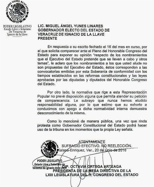 “En respuesta a su escrito fechado el 16 del mes en curso, por el que solicita comparecer ante el pleno del Honorable Congreso del Estado, para exponer su opinión ‘respecto de los nombramientos que el Ejecutivo del Estado pretende que se lleven a cabo y otros temas’, le aclaro que los nombramientos a los que usted alude no son propuestas del Ejecutivo del Estado, éstos corresponden a las convocatorias emitidas por esta Soberanía de conformidad con los tiempos establecidos en las reformas constitucionales y las leyes aprobadas por las diputadas y diputados del Honorable Congreso del Estado.