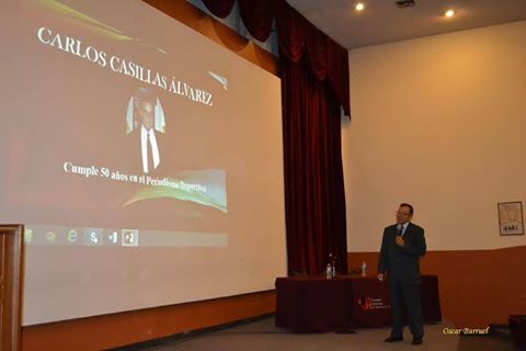 Previo a la proyección de las fotografías que atestiguan su carrera periodística, Franco Becerra, presidente de la SSA, hizo la presentación de Genaro Enríquez Rascón, director general de la Codeson, de un servidor y del propio Carlos Casillas, quien segundos antes de dar inicio con su exposición, solicitó un aplauso generalizado –todos puestos de pie– como homenaje póstumo al colega Jesús Arturo Llanes Camacho, fallecido el pasado 24 de mayo.