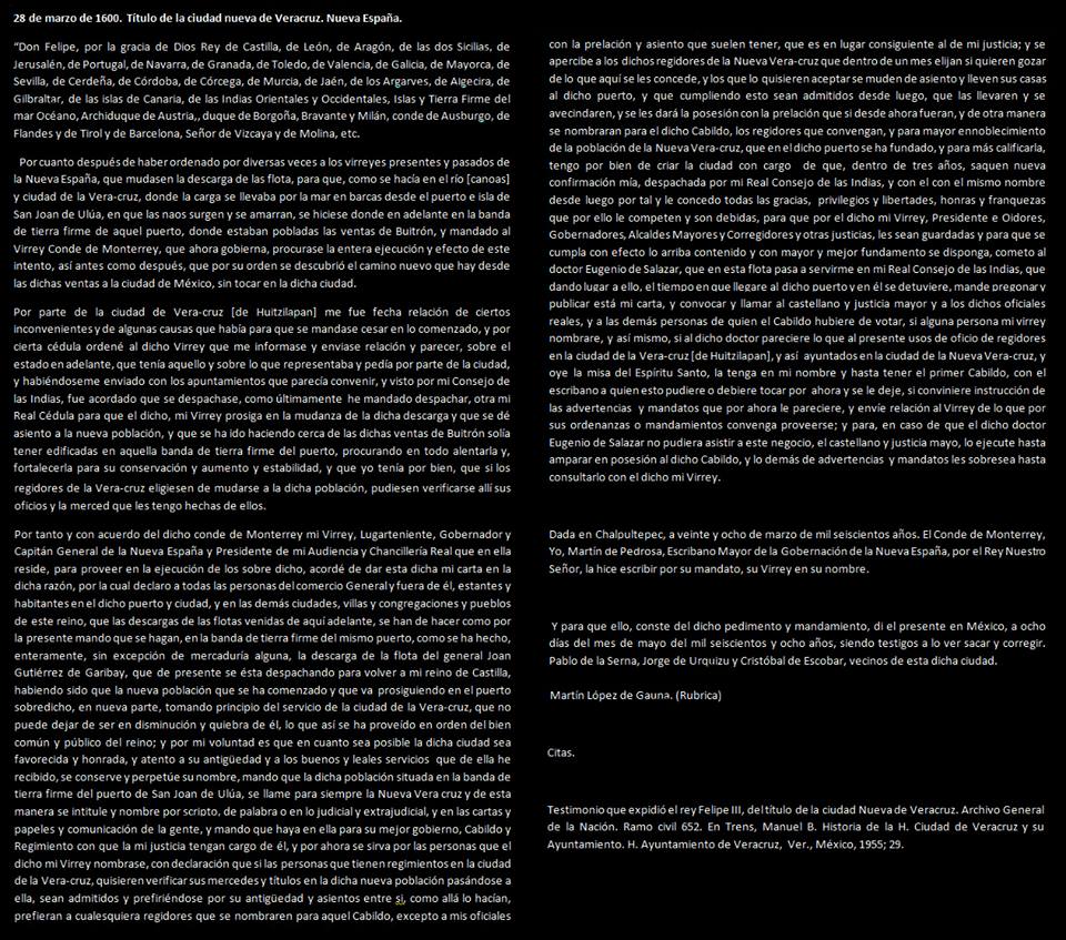 «… mando que la población que la dicha población (sic) sitia en la banda de tierra firme del puerto de San Joan de Ulúa, se llame para siempre la Nueva Veracruz, y de esta manera se intitule y nombre por scripto, de palabra o en lo judicial y extrajudicial, y en las cartas y papeles y comunicación de la gente, y mando que haya en ella para su mejor gobierno, Cabildo y Regimiento que con la mi justicia tengan cargo de él.»