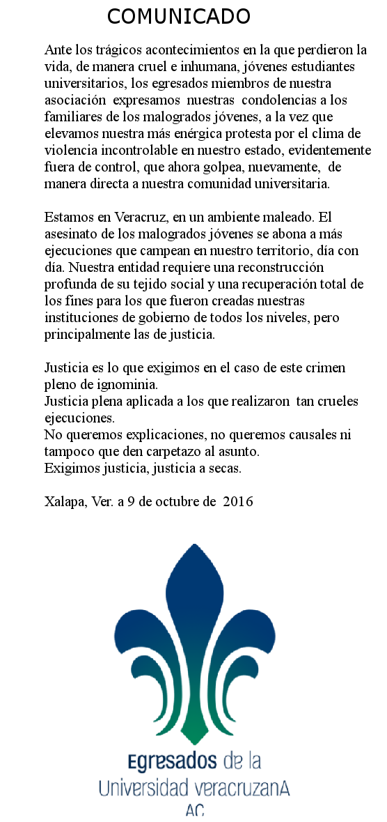 Comunicado de Egresados de la Universidad Veracruzana sobre el asesinato de los jóvenes universitarios