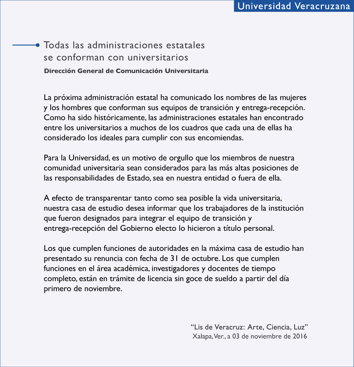 Aviso oficial de la Universidad Veracruzana sobre las renuncias y permisos de su personal que se incorporará al nuevo gobierno estatal