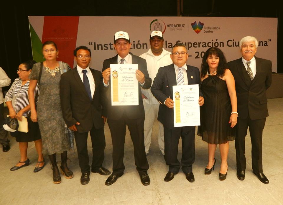 Momento histórico en que parte del equipo del proyecto premiado, sube a recibir el diploma y medalla de la Superación Ciudadana que otorga el Patronato de dicha premiación, en conjunto con el Ayuntamiento de Veracruz, organismos empresariales y representantes sociales del puerto jarocho. De izquierda a derecha: Mario Jesús Gaspar Cobarrubias, Guillermo Ávila Valladares, Ana Andrade, Wences Hernández y Enrique Espinoza.
