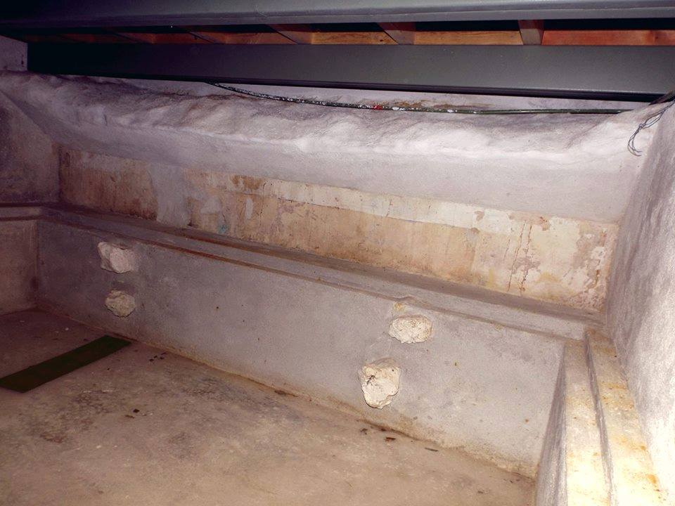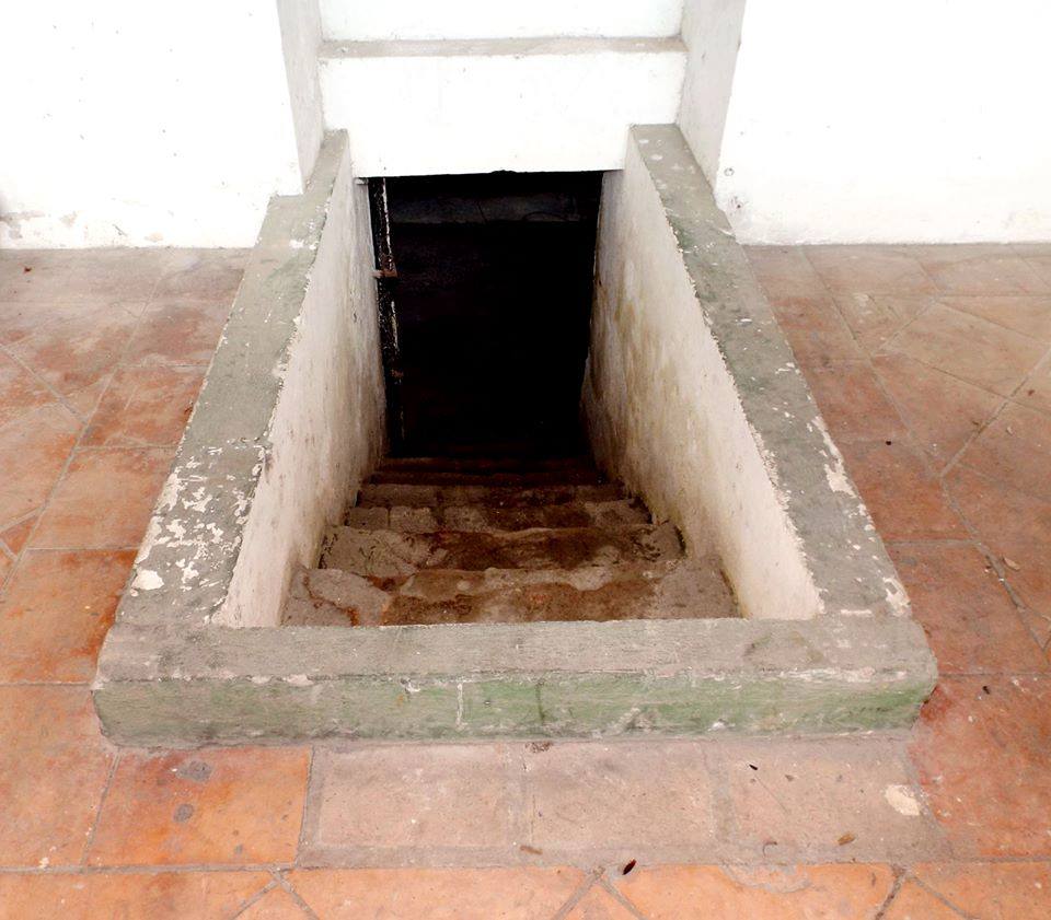 Se trata de una cámara subterránea no muy grande, de aproximadamente 5 metros de largo y 2 metros y medio de ancho, orientada en eje noroeste-suroeste, en el techo se aprecia el sistema de vigas de madera empotradas que soportan el piso encima.