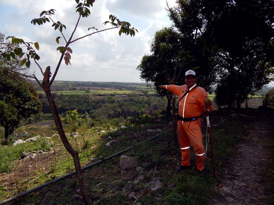 A las 11:15 AM, iniciamos la parte del ascenso a pie abandonando del sendero por el que llegamos y por donde no entran vehículos. En fila india, seguimos a nuestro guía. Yo marcho en retaguardia, para documentar la subida y sus peripecias. Sobre mi viaja el equipo de medición-geoposición, medicinas y agua, más la mochila de la cámara Nikon. Mi novia Carmen Castro o Yolis, transporta la comida y la provisión grande de agua fresca, así como mi machete de 18″. Ambos vamos equipados de varas de madera de cabo de lanza, cortada en las selvas interdunales de La Antigua por nuestro mutuo amigo Owences García y que facilitan mucho subir en terrenos muy accidentados