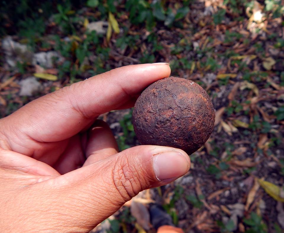 Antes de bajar rumbo a San Alejo, me muestran una bala de artillería encontrada en el cerro, comprensible por ser sitio de confirmada presencia y actividad militar en el siglo XIX, Está hecha de hierro sólido y tiene un diámetro de 15 centímetros, con un peso aproximado de 150 gramos. Será interesante calcular el calibre del cañón que podría dispararla y conocer si coincide con el cañón que bajado del Chiquihuite, descansa desde 1941 montado en un pedestal del parque municipal de Atoyac. — en Municipio de Atoyac.
