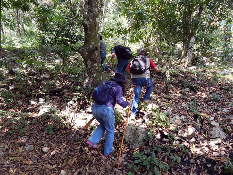 A las 11:15 AM, iniciamos la parte del ascenso a pie abandonando del sendero por el que llegamos y por donde no entran vehículos. En fila india, seguimos a nuestro guía. Yo marcho en retaguardia, para documentar la subida y sus peripecias. Sobre mi viaja el equipo de medición-geoposición, medicinas y agua, más la mochila de la cámara Nikon. Mi novia Carmen Castro o Yolis, transporta la comida y la provisión grande de agua fresca, así como mi machete de 18". Ambos vamos equipados de varas de madera de cabo de lanza, cortada en las selvas interdunales de La Antigua por nuestro mutuo amigo Owences García y que facilitan mucho subir en terrenos muy accidentados