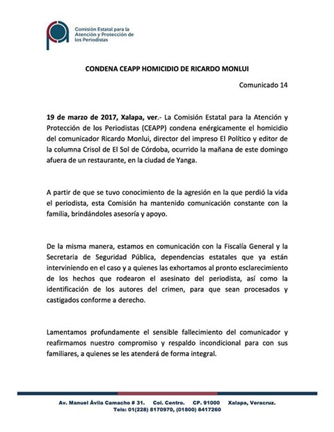 Comunicado de la Comisión Estatal para la Atención y Protección de Periodistas sobre el asesinato de Ricardo Monluí Cabrera