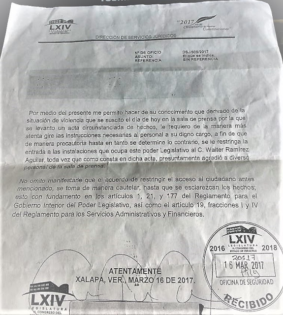 La prepotencia y los ánimos represivos en el Congreso del estado se manifestaron sobre todo contra Walter Ramírez, director del portal Noticas Desde Veracruz, al cual lo calumniaron al decir que había “agredido a diverso personal en la sala de prensa” y por lo mismo le “restringieron” el acceso al recinto legislativo, según dice en algo que parece un oficio con número DSJ/608/2017, pero al cual le cubrieron tanto el nombre de quien firma, como a quien va dirigido.