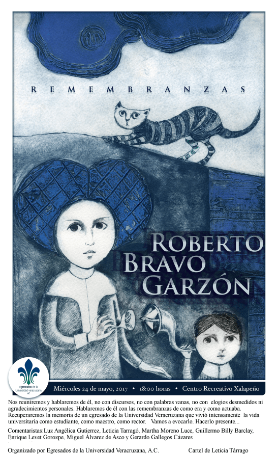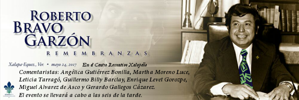 Como parte de sus actividades de promover la figura de los egresados más destacados de la máxima casa de cstudios de Veracruz, la organización de la sociedad civil «Egresados de la Universidad Veracruzana, A.C.» organiza un foro denominado Remembranzas: Roberto Bravo Garzón, que se llevará a cabo este miércoles 24 de mayo, en el Centro Recreativo Xalapeño, de la capital veracruzana, a las seis de la tarde, con los comentarios de Luz Angélica Gutiérrez Bonilla, Martha Moreno Luce, Leticia Tarragó, Enrique Levet Gorozpe, Guillermo «Billy» Barclay, Miguel Alvarez de Asco y Gerardo Gallegos Cázares.