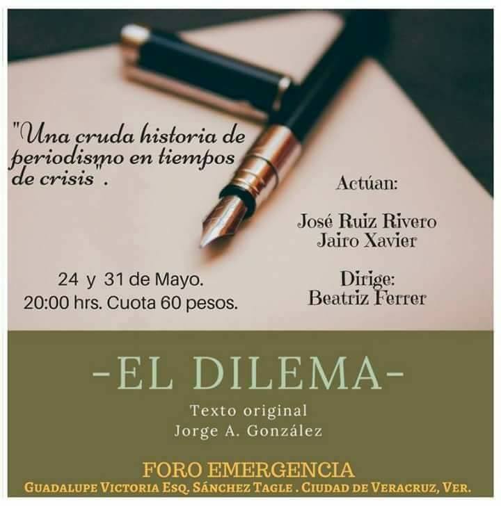 Invitamos a la ciudadanía veracruzana para que asistan a la puesta en escena de la obra teatral, EL DILEMA, escrita por nuestro colega, Jorge A. González. Es un drama que alude a un problema fundamental en nuestro país, el paulatino exterminio selectivo de periodistas, mediante asesinatos a mansalva, y la permanente disyuntivo de ejercer un periodismo crítico o uno subvencionado a los intereses de poder preestablecido. Actúan José Ruiz Rivero y Xairo Javier. Dirige Beatriz Ferrer.