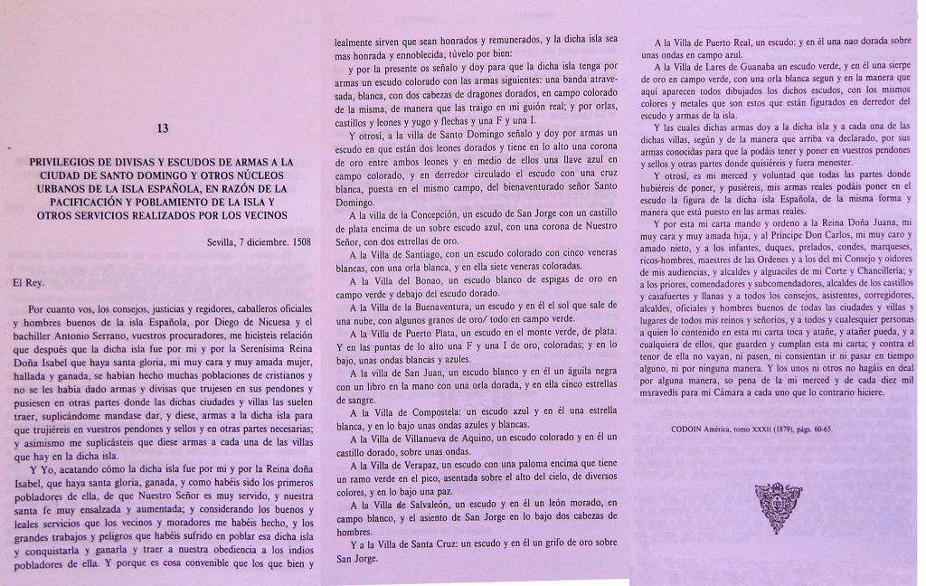 Obrando en concordancia con las Leyes de Indias vigentes, el 7 de diciembre de 1508, estando la corte alojada en Sevilla, el rey Fernando II de Aragón, en calidad de regente de su hija Juana, reina propietaria de Castilla, emite la real cédula que otorga escudo de armas a las poblaciones existentes en la isla de La Española y bajo la gobernación de Ovando. Fueron beneficiadas con este privilegio, que les otorgaba también el Título de Ciudad, catorce villas legalmente reconocidas e incluso la misma isla de La Española.