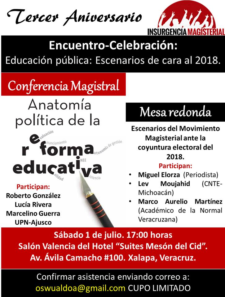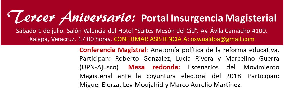 Nos es grato compartir la invitación al magno encuentro del Tercer Aniversario del Portal Insurgencia Magisterial, que se efectuará el sábado 1 de julio, a la cinco de la tarde, en el salón Valencia del Hotel Mesón del Cid, aquí en la ciudad de Xalapa.