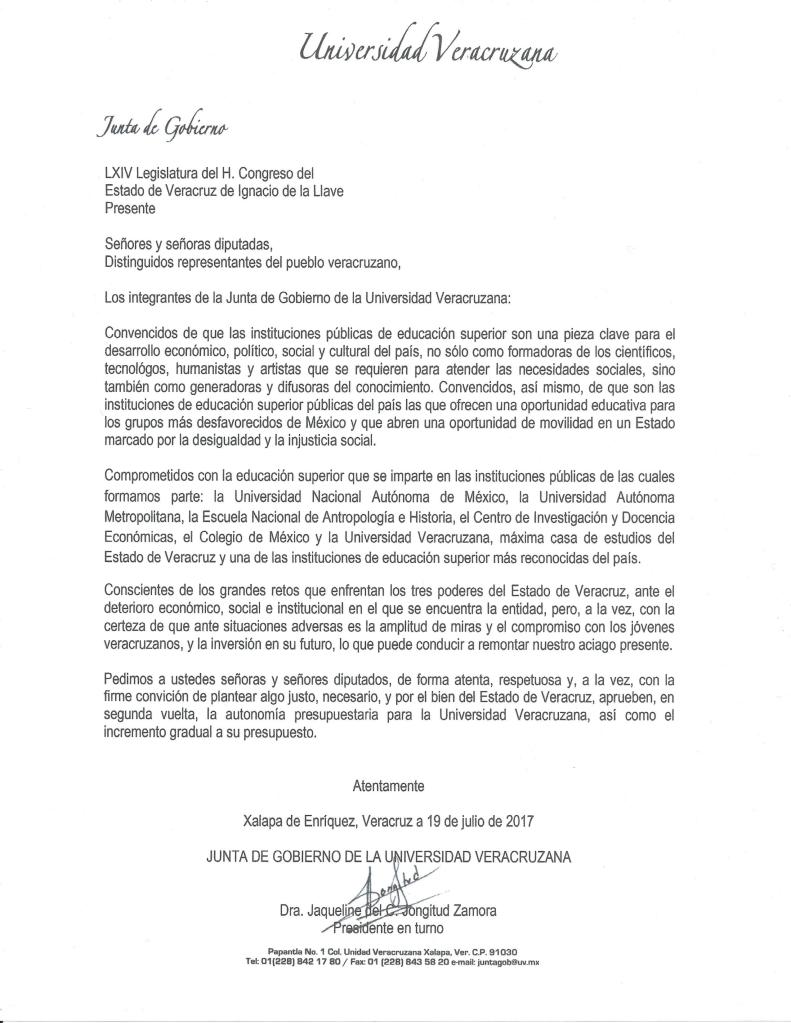 Carta de la H. Junta de Gobierno de la Universidad Veracruzana dirigida al H. Congreso del Estado de Veracruz