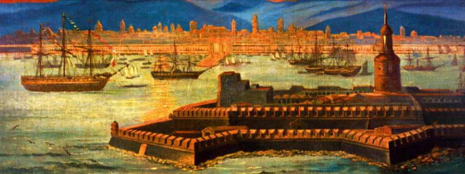 Vista desde la ciudad de Veracruz, del polvorín y la torre del Caballero Alto, junto a la cuál estaba ubicado el asta del telégrafo óptico de San Juan de Ulúa, agosto 28 de 2013 (Fuente: Archivo del Lic. Mario Jesús Gaspar Cobarruvias)