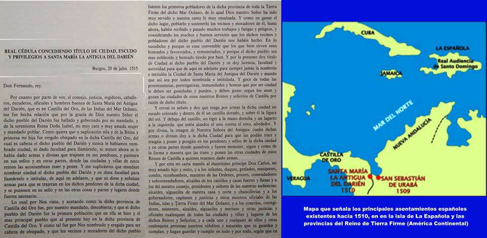 Hoy 20 de julio de 2017, se cumplen 502 años de que el rey Fernando II de Aragón, otorgó desde la ciudad española de Burgos, a la villa de Santa María de La Antigua del Darién, fundada hacia el 20 de octubre de 1510 en el istmo de Panamá, la real cédula que le confirió su Título de Ciudad, escudo de armas y le confirmó como sede del primer obispado de la América Continental. De esta forma, esta población que era también la capital de la provincia de Castilla del Oro, se convirtió en la quinceava ciudad hispanoamericana reconocida jurídicamente por la corona española, así como el primer cabildo dotado de ayuntamiento (edificio de sesiones) y municipio (territorio) de la América Continental; nueve años antes de la fundación de la Villa Rica de la Vera Cruz en mayo de 1519.