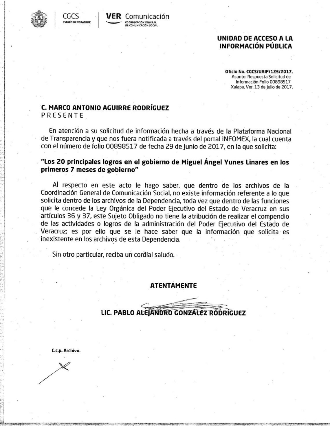 La respuesta es firmada y avalada por Pablo Alejandro González Rodríguez, quien es uno de esos casos raros de funcionarios que funcionarios que estuvieron durante el fidelato, que no sólo sobrevivieron el cambio de administración, si no que además fue promovido.