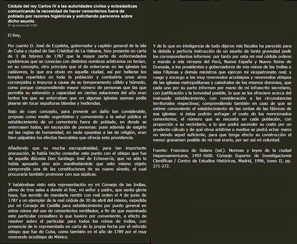 CÉDULA DEL REY CARLOS IV A LAS AUTORIDADES CIVILES Y ECLESIÁSTICAS COMUNICANDO LA NECESIDAD DE HACER CEMENTERIOS FUERA DE POBLADO POR RAZONES HIGIÉNICAS Y SOLICITANDO PARECERES SOBRE DICHO ASUNTO, 500 años de México en documentos, Siglo XVIII > 1780-1789: http://www.biblioteca.tv/…/C_dula_del_rey_Carlos_IV_a_las_a…