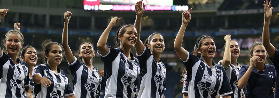 Jubilosa celebración de las rayadas de Monterrey al concluir el encuentro contra Tigres-UANL. El primer clásico femenil regiomontano. Foto del portal Liga MX Femenil.