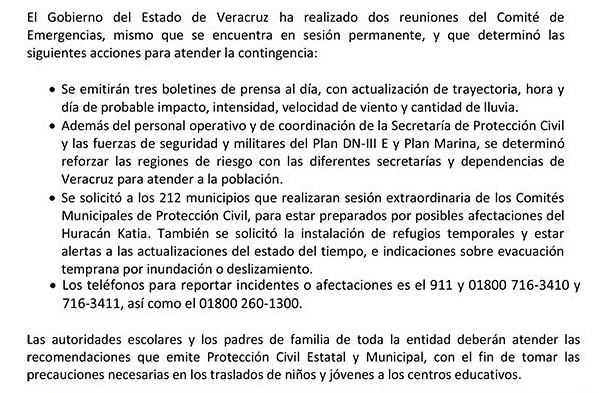 Aviso del Gobierno del Estado de Veracruz sobre los boletines que emita en el día sobre huracán Katia