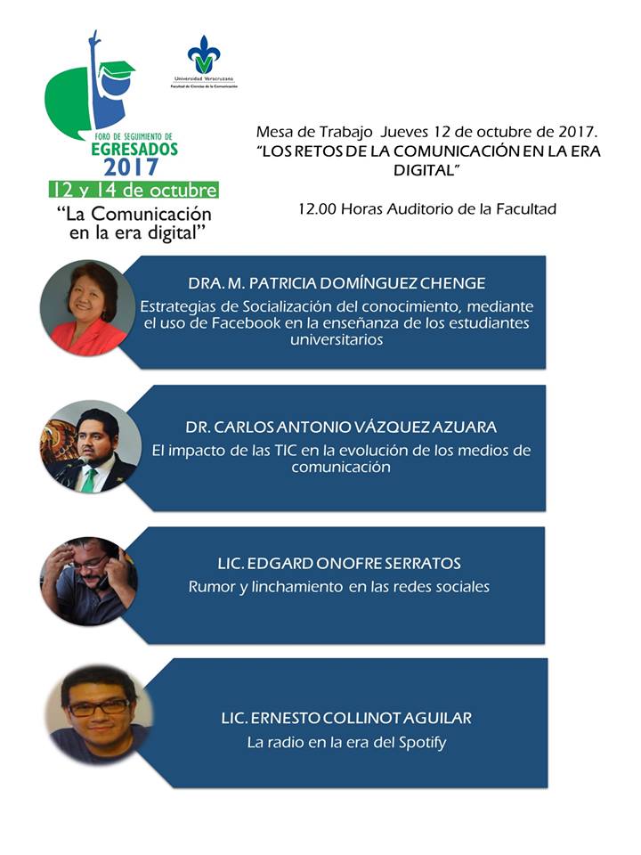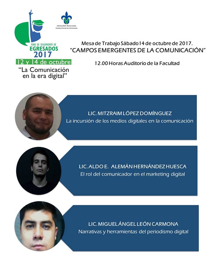 Invitamos a todos los egresados a participar, ya sea de manera presencial o virtual, en el Foro de Seguimiento de Egresados de la FACICO 2017, que tendrá su fase presencial los días 12 y 14 de octubre, y en su fase virtual, las 24 horas de los días 12, 13,14 y 15 de octubre. Para la fase presencial hay que acudir a las instalaciones de la facultad, en los dos días mencionados. Para la fase virtual solo hay que inscribirse en el siguiente grupo de facebook: https://www.facebook.com/groups/130307674360839/ En este espacio contarán con herramientas digitales para poder aportar comentarios, ponencias, textos, conferencias mediante el uso de un sistema de videoconferencia en vivo, o grabaciones de video para posterior discusión. Así también se dispondrá de apoyo para enviar textos escritos o cápsulas de audio, con la misma finalidad de aportar sus experiencias, opiniones y perspectivas sobre el tema del foro: «La Comunicación en la Era Digital»