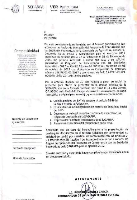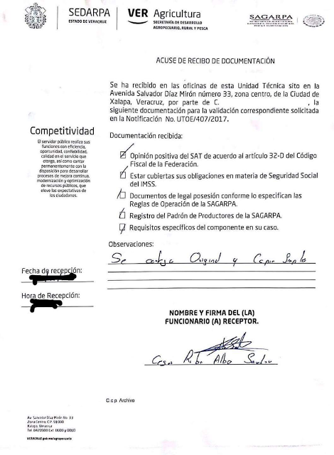 Los productores cumplieron en tiempo y forma con dicha solvatación, ya que cuentan con su acuse correspondiente firmado por personal de la SEDARPA, -del cual nos enviaron una copia- luego los citaron en las instalaciones de la Secretaría en Xalapa, para darle seguimiento al trámite, el cual consiste, de acuerdo a las reglas de operación de dicho programa en: