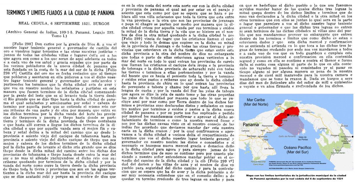 El documento comienza con la fórmula de autoridad real dirigida del rey Carlos I a las autoridades de sitios a quienes podría involucrar este trámite. Luego se dirige a los habitantes de Panamá recordando que la solicitud del trámite de sus términos o limites territoriales como ciudad, había sido solicitado desde su fundación en 1519. Luego describe la extensión del distrito municipal, que en resumen, llegaría hasta las sierras de Pacora por el norte y a una distancia de 9 leguas, al sur hasta las islas de las Perlas distantes 30 leguas, al este 9 leguas hasta una zona intransitable y montañosa, y al oeste 17 leguas. En total, la ciudad gobernaba unos 2.000 kilómetros cuadrados en tierra más el espacio del mar hasta las mencionadas islas, englobando además numerosas cacicazgos indígenas. El texto menciona también tales limites ya se habían señalado y marcado con mojoneras en la parte de tierra, cabe señalar que la parte de mar era imprecisa dado el incompleto conocimiento de esta faja continental en 1519, pero daba acceso a los españoles de Panamá a la explotación de los ricos bancos de perlas que daban nombre a las islas.